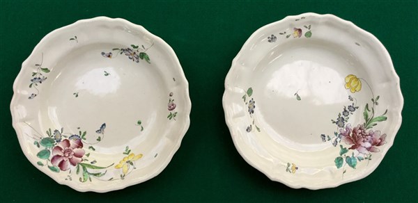 Manifattura di Lodi, secolo XVIII. Coppia di fondine in maiolica con bordo mistilineo, decorate a fiori. Marca "chiodo" al retro (d. cm 24) (difetti)