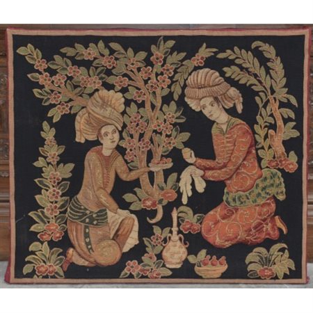 Tessuto a mano in lana e seta, decoro con personaggi regali persiani in abiti tradizionali con albero della vita in policromia su fondo nero. In telaio (110xh. 93) (lievi difetti)