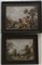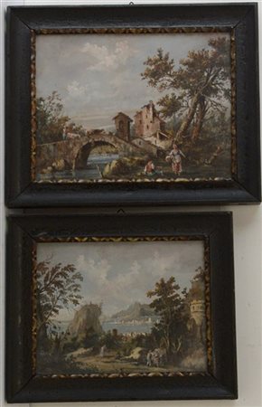 Scuola del secolo XIX "Paesaggi con figure" due dipinti a tempera su carta applicata su tavola (cm 22,5x30 e cm 20x26,5). Uno con firma indecifrabile. In cornici in legno laccato coeve (difetti)