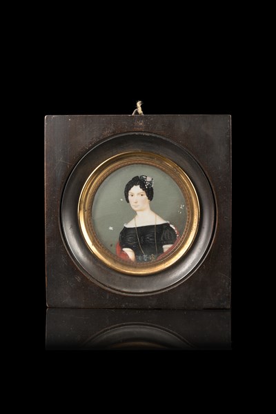 Maestro del secolo XIX "Ritratto di nobildonna pesarese" miniatura tonda su avo