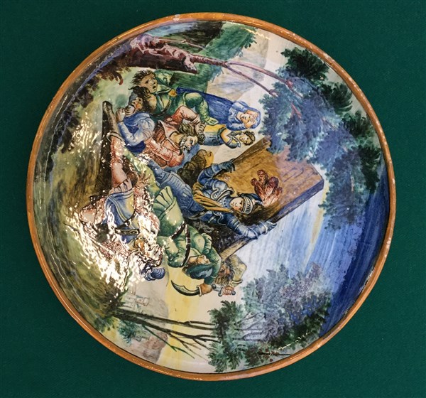 Manifattura del secolo XIX. Alzata in maiolica policroma decorata a scena storica (d. cm 31) (restauri)