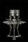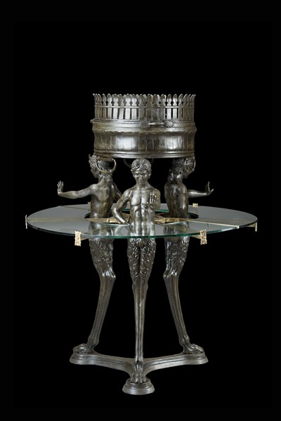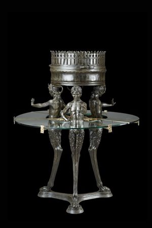 Recipiente portatile da centro sala in bronzo in stile pompeiano, montanti a forma di zampe ferine su base tripode, montato a fioriera; piano in cristallo (cm 152x135) (difetti)