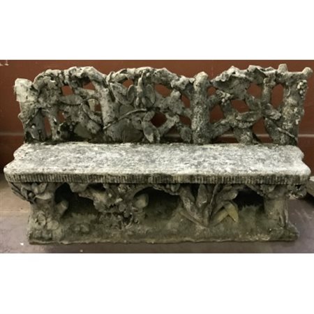 Fornitura da giardino in pietra serena a forma di rami intrecciati ed elementi naturalistici, composta da una panca a tre posti e due sedie (difetti)