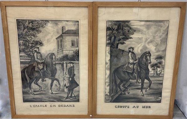 "Croupe au mur" e "Lepaule en dedans" coppia di disegni a lapis e carboncino a soggetto cavalleresco, titolati e firmati in basso al centro (fogli cm 102x70), in cornici (difetti)