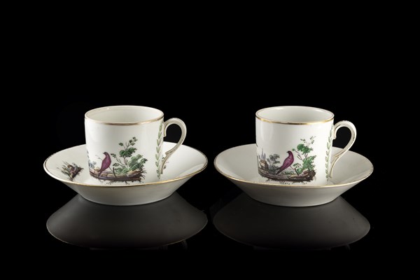 Manifattura di Ginori, Doccia, secolo XIX. Coppia di tazze con piattino in porcellana decorate con volatili in paesaggio, profilate in oro (difetti)