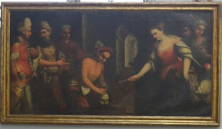 Scuola italiana della fine del secolo XVII "Salomè riceve la testa del Battista" olio su tela (cm 105x200) In cornice (difetti e restauri)