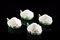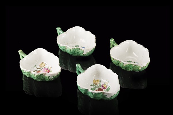 Manifattura del secolo XVIII. Gruppo di quattro cremiere in maiolica policroma in forma di foglia decorate all'interno con mazzi fioriti (difetti)