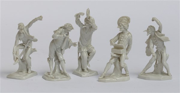 Manifattura del secolo XX "Maschere della commedia dell'arte" gruppo di cinque statuine in porcellana smaltata bianca (h. max cm 11 ca) (lievi difetti)