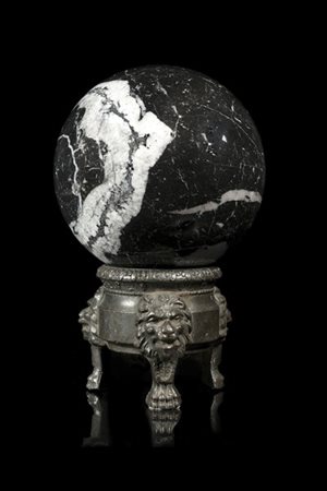 Sfera in marmo nero su antica base tripode in bronzo decorata a teste e piedi leonini