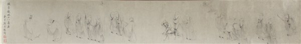 Scroll orizzontale raffigurante i diciotto luohan di Li Longmian, firmato Tang Yin, con iscrizione e sigillo, inchiostro su carta