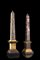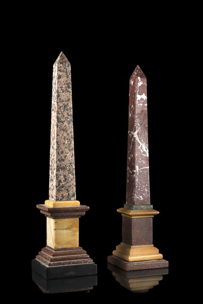 Due antichi obelischi, uno in granito e uno in marmo rosso, su basi squadrate in porfido e marmo giallo di Siena (h. max cm 39) (difetti)