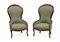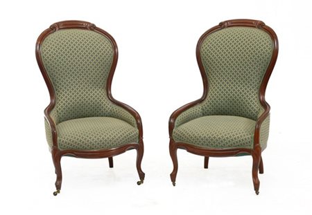 Coppia di poltrone con schienali intagliati a volute. Gambe anteriori mosse munite di rotelle. Secolo XIX. Rivestite in tessuto verde a decoro geometrico (lievi difetti)