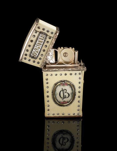Porta nécessaire in avorio decorato con silhouette di gentiluomo e da cifre "CB