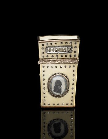 Porta nécessaire in avorio decorato con silhouette di gentiluomo e da cifre "CB" e inscritto "souvenir d'amitié", contenente servizio da toilette. Ghiere in metallo dorato. Francia, inizio secolo XIX (h. cm 9) (difetti e rotture)