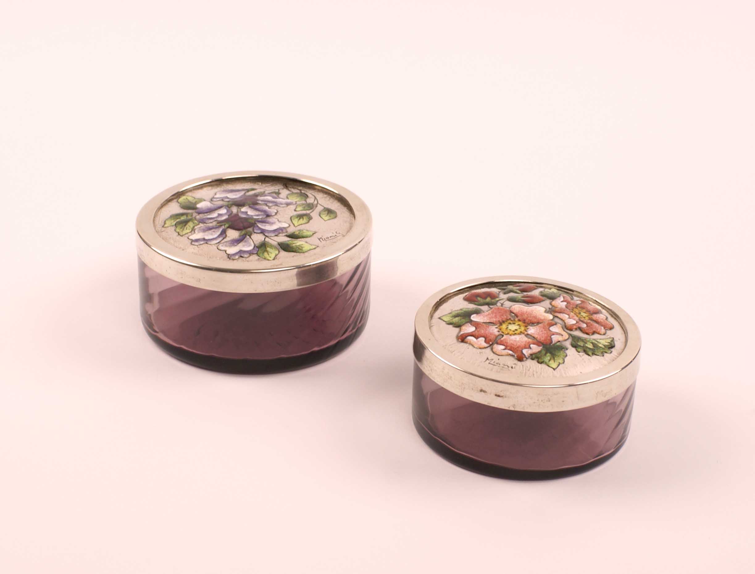 COPPIA DI SCATOLE CIRCOLARI Italia vecchia manifattura In vetro viola con coperchi in argento e smalto policromo, misure diverse
