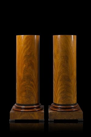 Coppia di mezze colonne lastronate in palissandro, su basi quadrate (h. cm 108) (difetti)