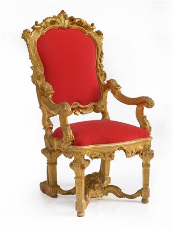 Poltrona da parata in legno dorato e riccamente intagliato a volute vegetali, riccioli e conchiglie. Gambe a balaustra riunite da traverse sagomate decorate al centro da stemma (difetti, mancanze e restauri)