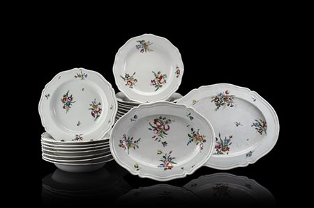Manifattura di Ginori, Doccia, secolo XVIII. Parte di servizio da tavola in porcellana decorato in policromia a fiori. Composto da venti tra piatti piani e fondi e due vassoi (difetti)