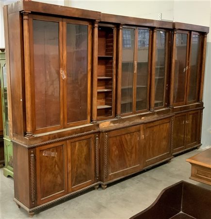 Libreria lastronata con parte superiore ad otto ante a vetri e parte inferiore a sei ante. Alzata con montanti a colonna tornita e a mezza colonna intagliata nella base. Secolo XIX (cm 400x230x38) (difetti e mancanze)