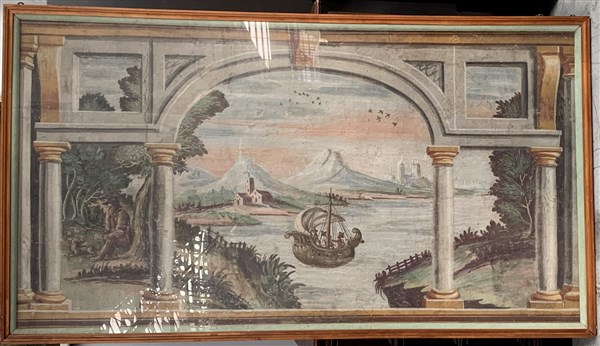 Antico strappo d'affresco raffigurante paesaggio (cm 105x203) in cornice (difet