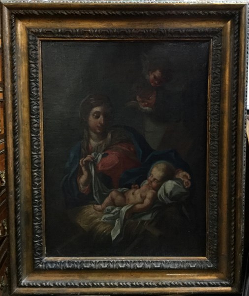 Scuola del secolo XVIII "Madonna con Bambino e cherubini'' olio su tela (45x34)
