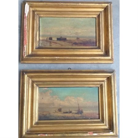 "Marina con pescatori" coppia di dipinti ad olio su tavola (cm 18x25) Siglati in basso a sinistra e destra. In cornici (difetti e mancanze)