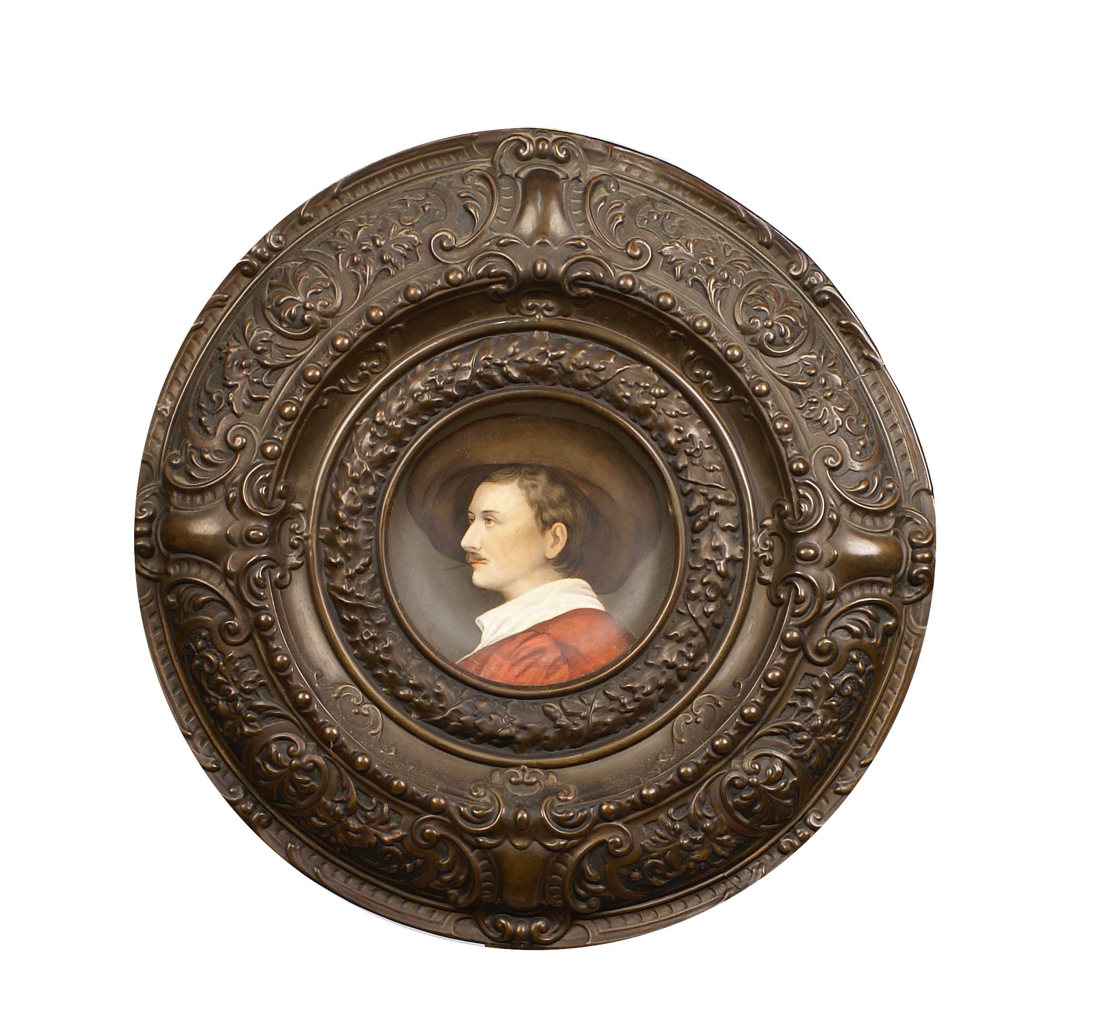 PIATTO IN METALLO SBALZATO fine del XIX Sec. Con al centro una placca in porcellana dipinta in policromia a raffigurare un ritratto maschile D. 44 cm.