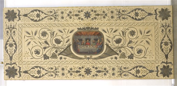 Ricamo in fili d'argento su taffetà di seta color crema. Decorato da due cornucopie con rami fioriti, uva e spighe di grano contornano un medaglione dipinto su seta raffigurante l'ultima cena (cm 215x92) (lievi difetti)