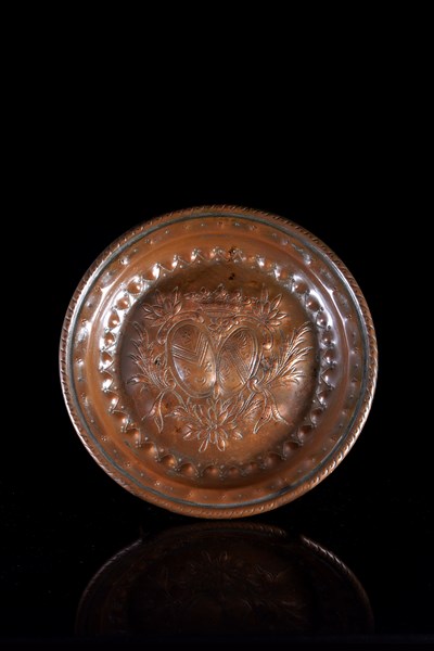 Piatto in rame sbalzato nel cavetto a stemmi nobiliari con corona ducale. Secol