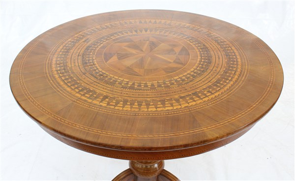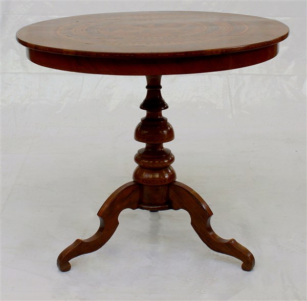 Tavolo tondo con sostegno tornito su tre gambe mosse decorato con filettature e intarsi a motivi geometrici. Emilia secolo XIX (d cm 90 h cm 78) (difetti)
