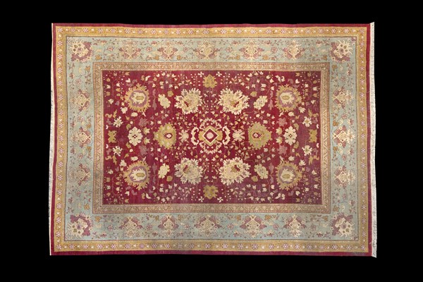 Tappeto Amritzar, India seconda metà secolo XIX. Decoro "all-over" con grandi fiori in file geometriche di ispirazione Mogul su fondo rosso rubino. Bordura principale con grandi fiori stilizzati su fondo azzurro acquamarina (cm 354x327) (difetti e restauri)