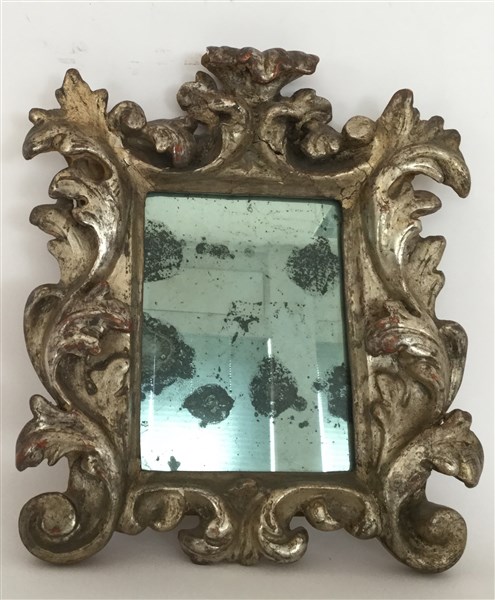 Piccola specchiera in legno argentato e intagliato a volute. Secolo XVIII (cm 3