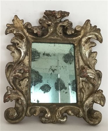 Piccola specchiera in legno argentato e intagliato a volute. Secolo XVIII (cm 35x30) (difetti)