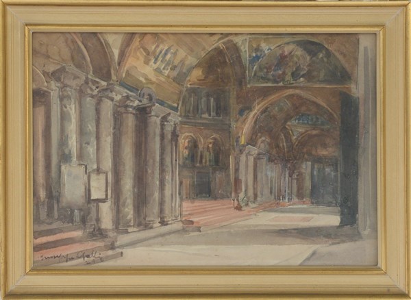 "Interno di chiesa" '24, acquerello su carta (cm 33x47.5) Firmato e datato in basso a sinistra. In cornice (Gravi difetti)