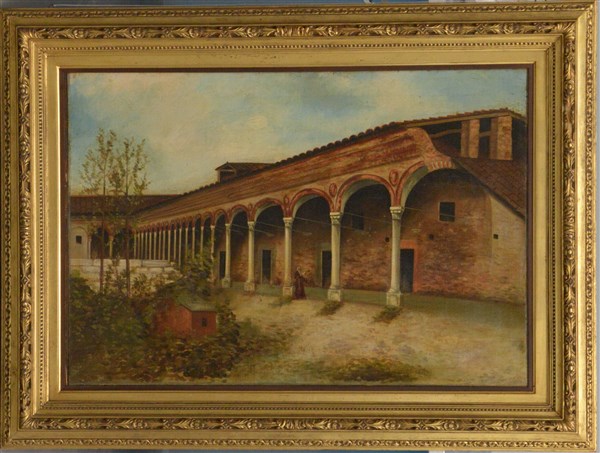 Ignoto "Il chiostro del monastero" olio su tela (cm 57x84) In cornice (difetti)