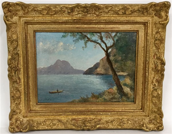 "San Salvatore, Lugano" olio su cartone (cm 24x33) Firmato in basso a sinistra. Al retro: timbro del pittore; titolato. In cornice