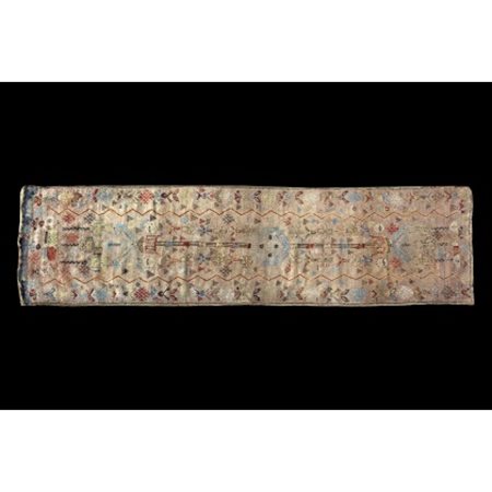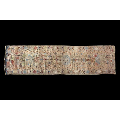 Tappeto passatoia anatolico decorato con motivi di ispirazione geometrica nei toni del rosso, azzurro e marrone su fondo lilla (cm 394x107) (difetti)