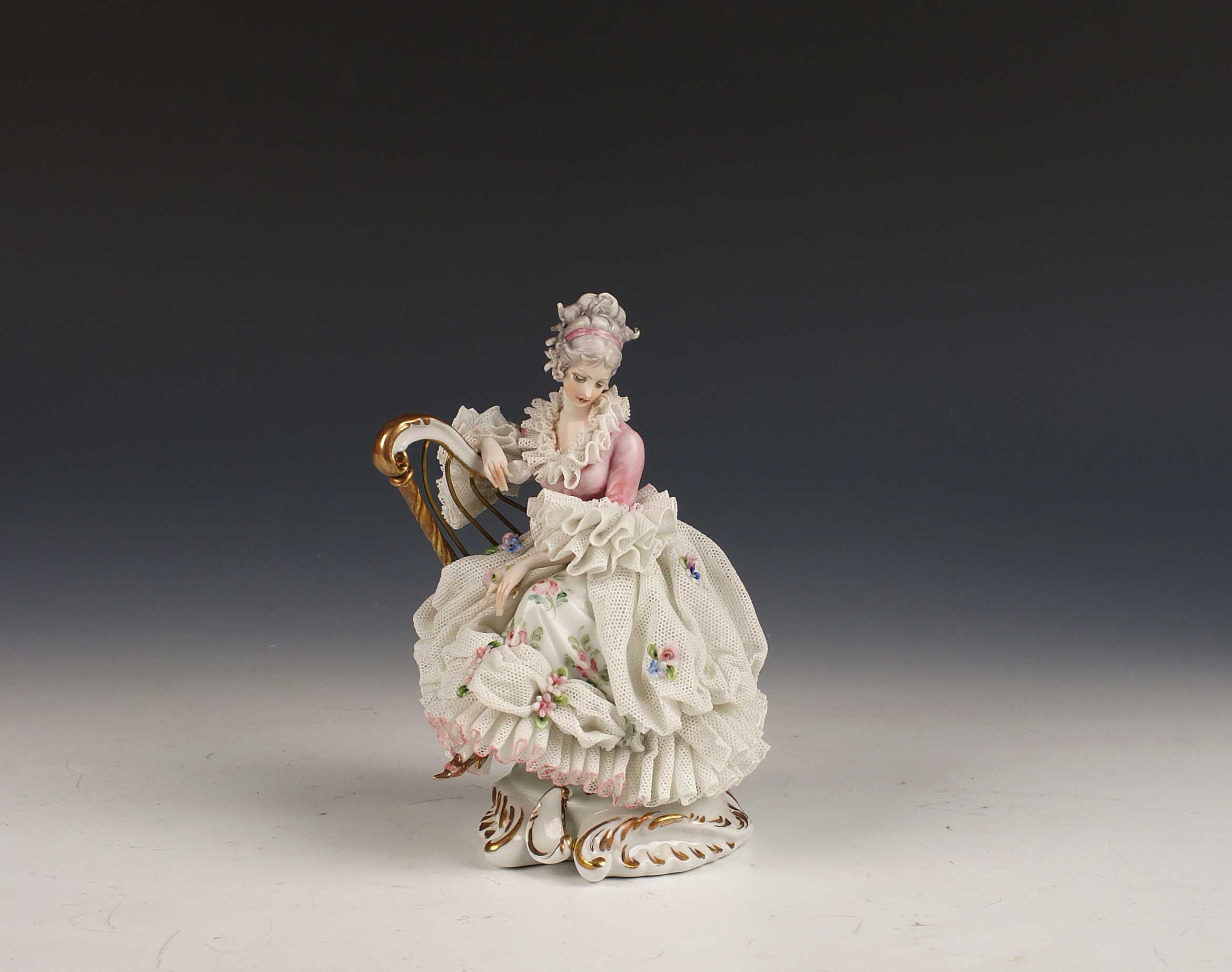 CAPODIMONTE XX Sec. Gruppo in porcellana raffigurante una suonatrice di arpa H. 17,5 cm.