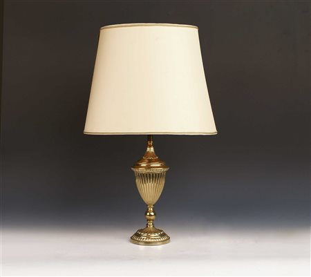 LAMPADA DI METALLO DORATO vecchia manifattura Stelo a balaustro completa di paralume H. 61 cm.