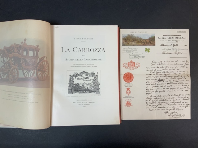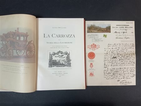 BELLONI Luigi. La carrozza nella storia della locomozione. Milano: Bocca, 1901. 4to, numerose illustrazioni nel testo. Esemplare EX DONO AUCTORIS di questo importante trattato sulla locomozione. Non collazionato e difetti da esaminare.
