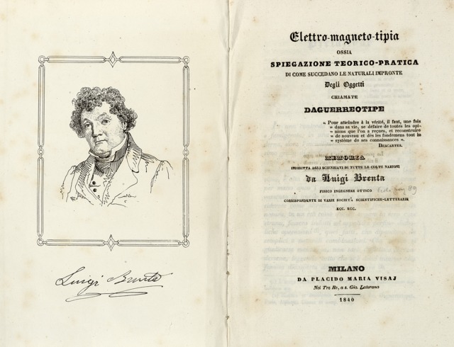 [FOTOGRAFIA] BRENTA L. Elettromagnetotipia ossia spiegazione teorico-pratica di come succedano le naturali impronte degli oggetti chiamate daguerreotipe. Milano: Visaj, 1840. Non collazionato e difetti da esaminare.