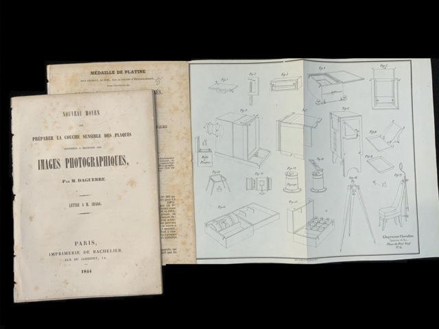 [FOTOGRAFIA]. DAGUERRE, M. Nouvea Moyen de Preparer la Couche sensible des plaques destinees a recevoir les Images Photographiques. Parigi: Bachelier, 1844. INSIEME A: Medaille de Platine. Pour l'invention du Daguerréotype a Verres Combinés. Con grande tavola ripiegata che mostra gli strumenti fotografici. Non collazionato e difetti da esaminare.