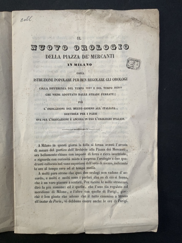 [OROLOGI] Il Nuovo Orologio della Piazza de' Mercanti in Milano. Milano: Bernadoni, 1859. Brossura coeva. Non collazionato e difetti da esaminare.