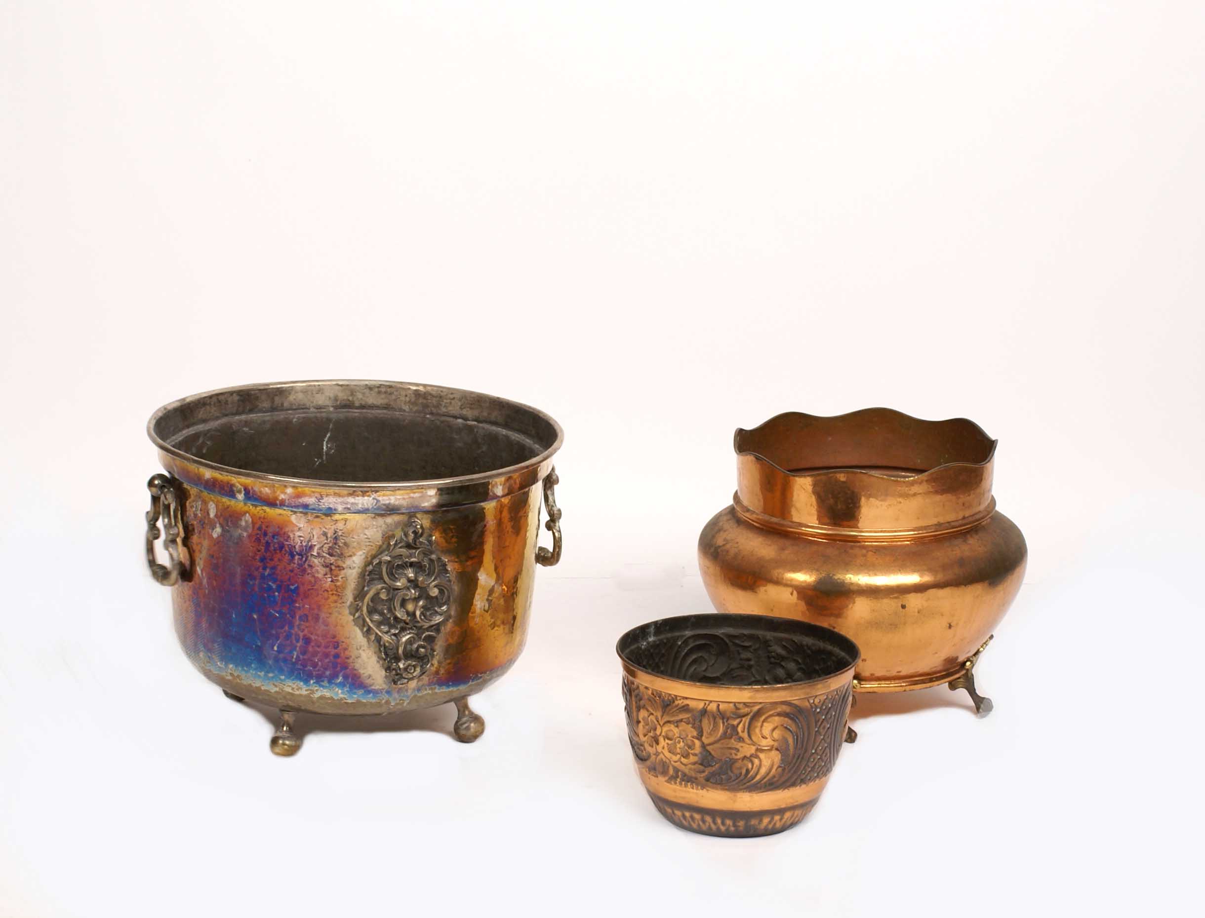 LOTTO DI TRE CACHEPOTS vecchia manifattura In rame, fogge e misure diverse