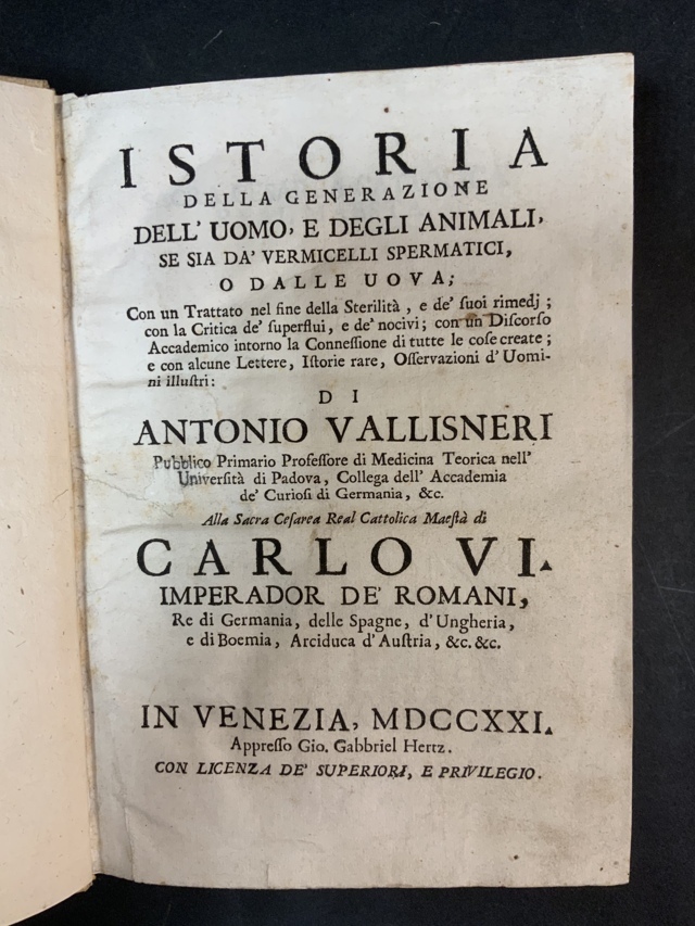 VALLISNIERI, Antonio (1661-1730) - Istoria della generazione dell'uomo, e degli animali, se sia da' vermicelli spermatici o dalle uova. Venice: Gio. Gabbriel Hertz, 1721.