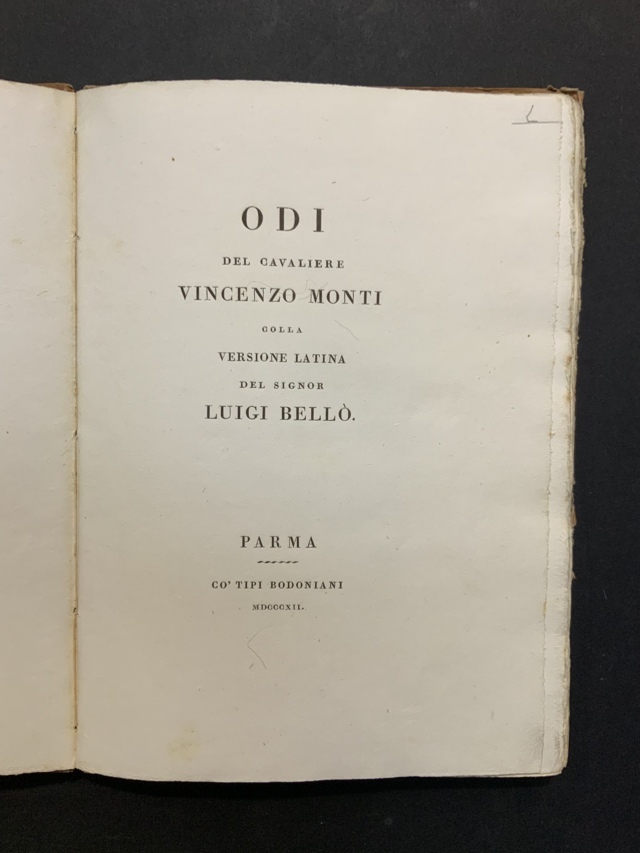 [BODONI] MONTI Vincenzo. Odi del cavaliere Vincenzo Monti colla versione latina del signore Luigi Bellò. Parma: Bodoni, 1812. 8vo. cartonato colorato coevo (dorso assente). Completo. Edizione bodoniana di 3 odi dedicate alla famiglia Bonaparte ed in particolare alla nascita del Re di Roma, l'Aiglon"