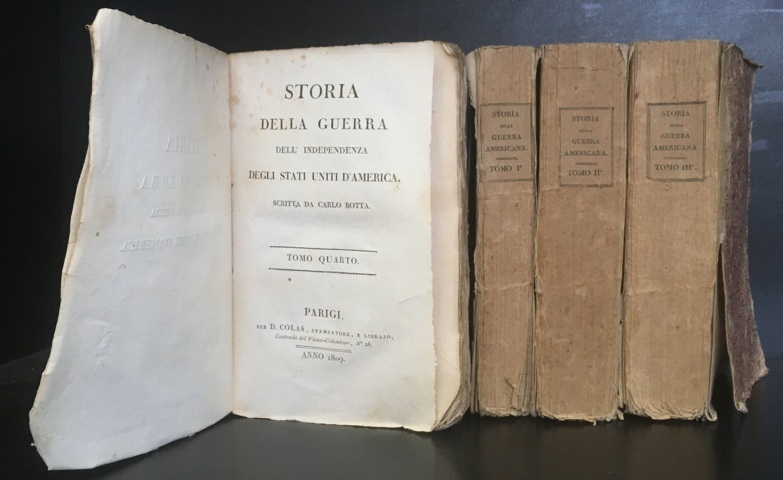 BOTTA, Carlo. Storia della Guerra dell'Indipendenza degli Stati Uniti d'America. Parigi: D. Colas, 1809. 4 volumi, 8vo. Brossura editoriale. Non collazionato e difetti da esaminare.