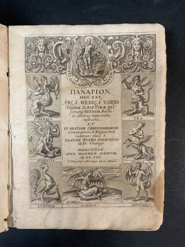 BUYS Jan (1547-1611) Panarion, hoc est Arca medica variis Divinae Scripturae priscorumque Patrum antidotis adversus animi morbos instructa. Magonza: Albinum, 1608. Frontespizio entro bella cornice allegorica (fori di tarlo e bruniture) Legatura coeva in piena pergamena floscia, titolo al dorso (piccole mancanze, macchia al piatto). Trattato teologico contro il vizio animato da un bel frontespizio figurato. Non collazionato e difetti da esaminare.