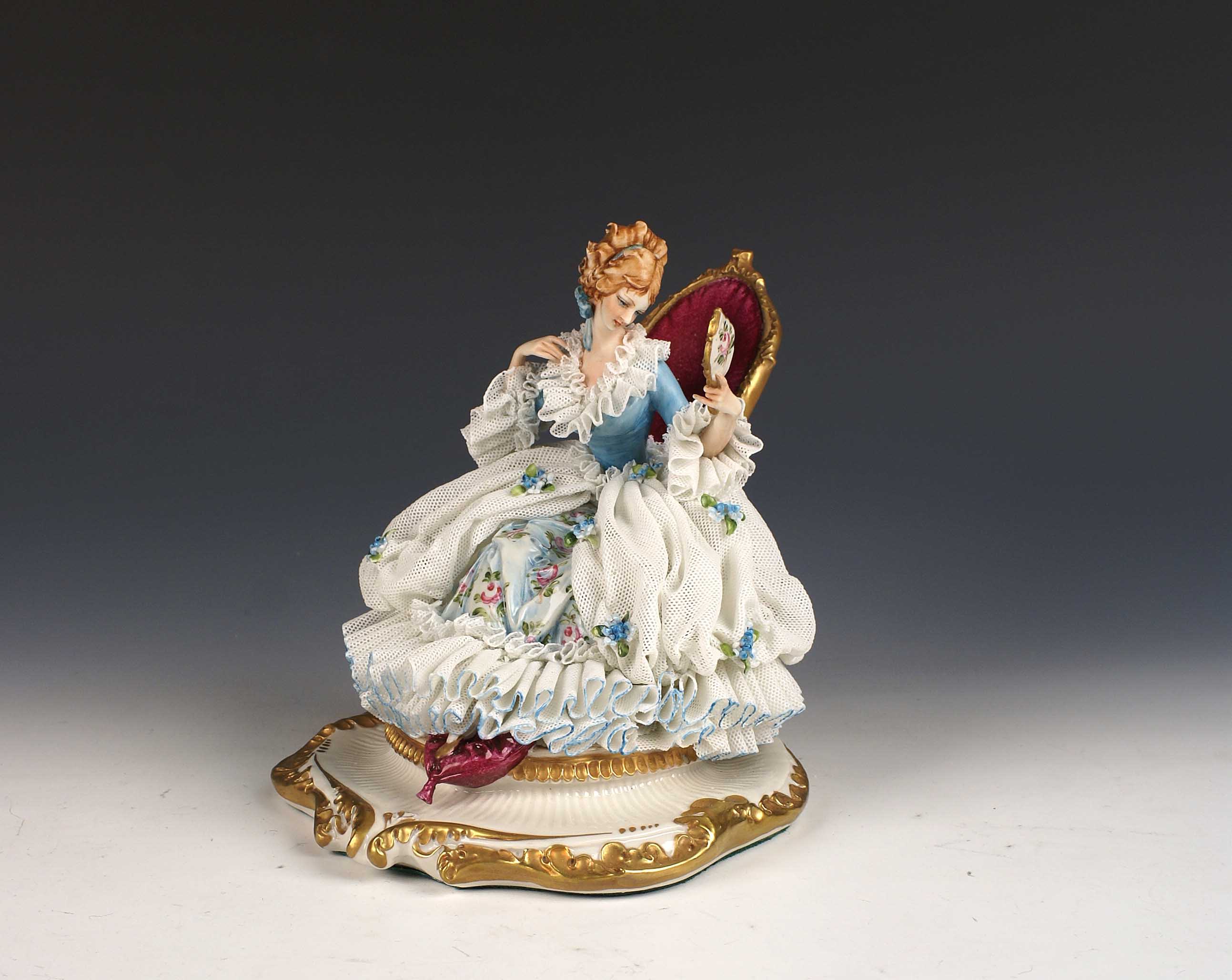 GIUSEPPE CAPPè Capodimonte XX Sec. Gruppo in porcellana policroma raffigurante una dama H. 19 cm.