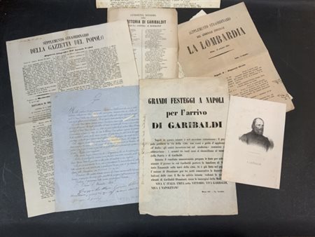GARIBALDI Giuseppe. Volantino del 1860 per i festeggiamenti dell'arrivo di Giuseppe Garibaldi a Napoli. INSIEME a una lettera firmata da diversi protagonisti del risorgimento fra cui Giuseppe La Farina e altro materiale relativo. Non collazionato e difetti da esaminare.